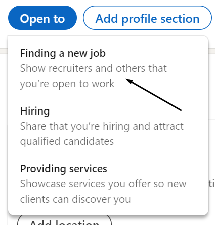 - שדרוג הפרופיל שלכם יעזור לכם להופיע ברשימת הפרופילים שהמערכת מציעה לצוותי הגיוס, אבל אם תרצו לקחת את החיפוש שלכם צעד קדימה ולאותת לצוותי הגיוס בלינקדאין שאתם פתוחים לקבל הצעות עבודה (בדיסקרטיות) תוכלו לעדכן את הפרופיל שלכם באופן הבא: